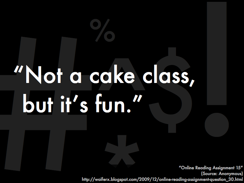 The last comment always gets a chortle out of many students. Following this last student comment is when the instructor tells the class that the intent of showing these comments is to respond to and expand upon them one-by-one, in order make several points regarding what is expected of students in this class.
