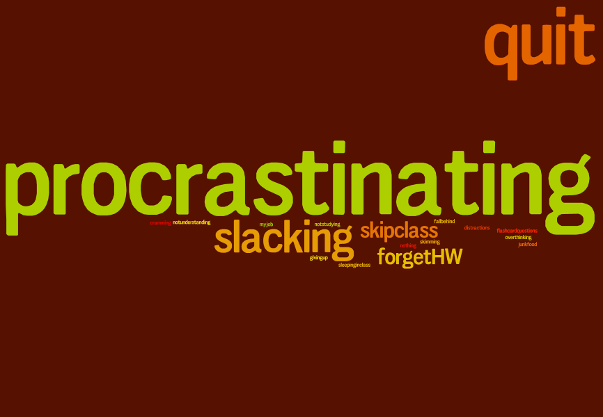 I need to stop putting off homework and reading until just before it is due. I also need to stop studying just an hour before quizzes and consistently study all week.
